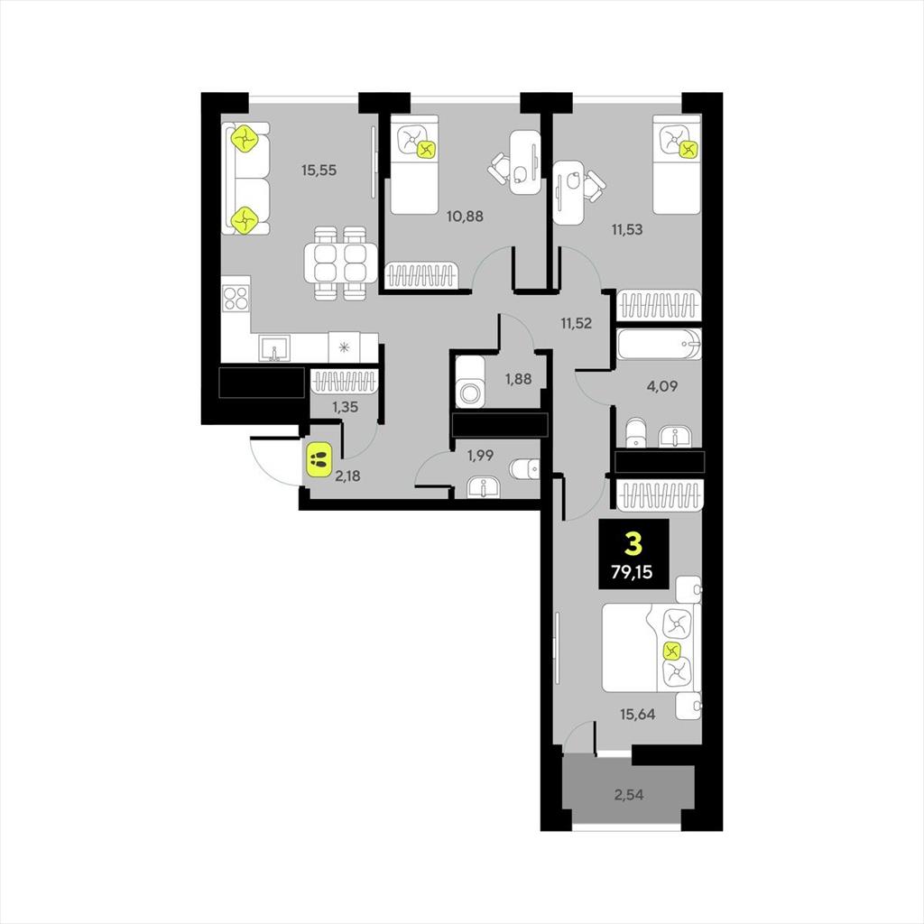 общая 79,15 м2, жилая 38,05 м2, кухни 0 м2 |