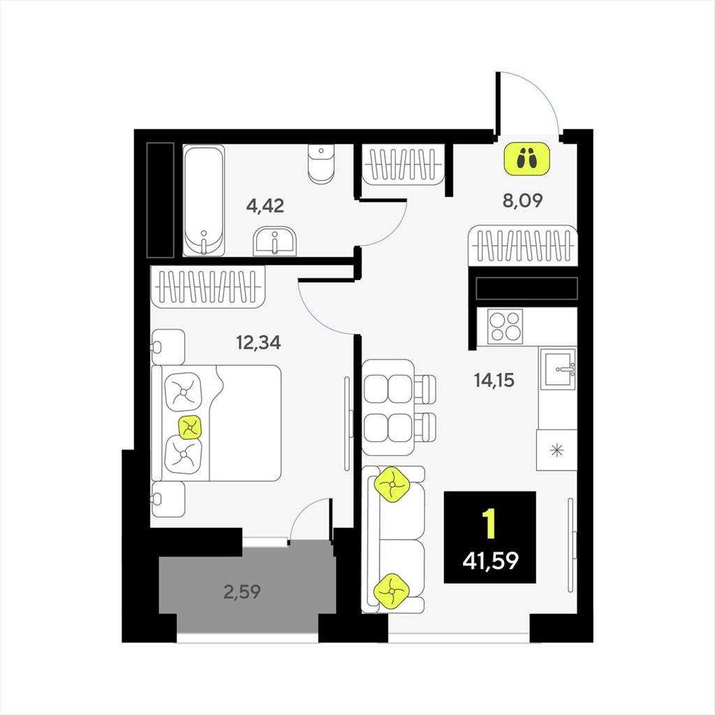 общая 41,59 м2, жилая 12,34 м2, кухни 0 м2 |