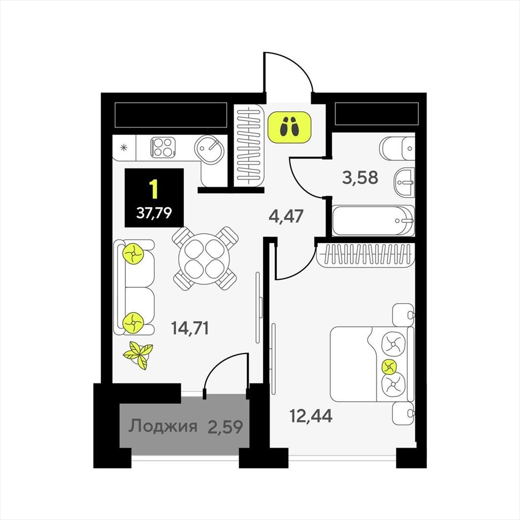 общая 37,79 м2, жилая 12,44 м2, кухни 0 м2 |
