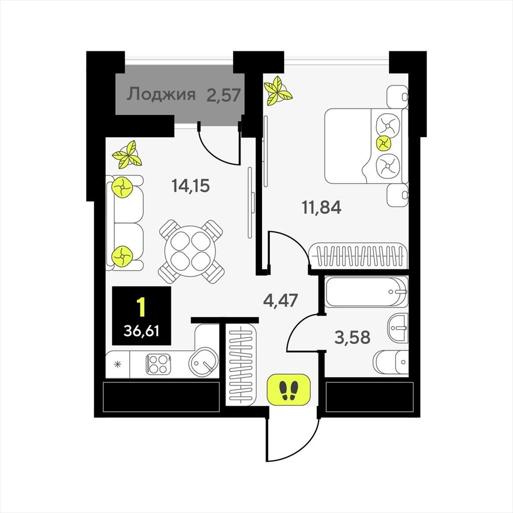 общая 36,61 м2, жилая 11,84 м2, кухни 0 м2 |