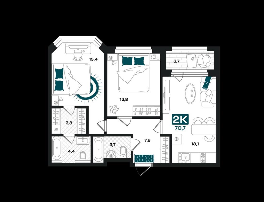 общая 70,7 м2, жилая 29,2 м2, кухни 0 м2 |