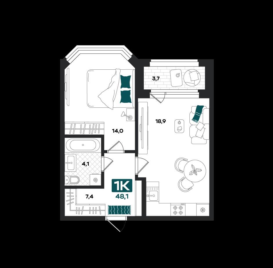общая 48,1 м2, жилая 14 м2, кухни 0 м2 |
