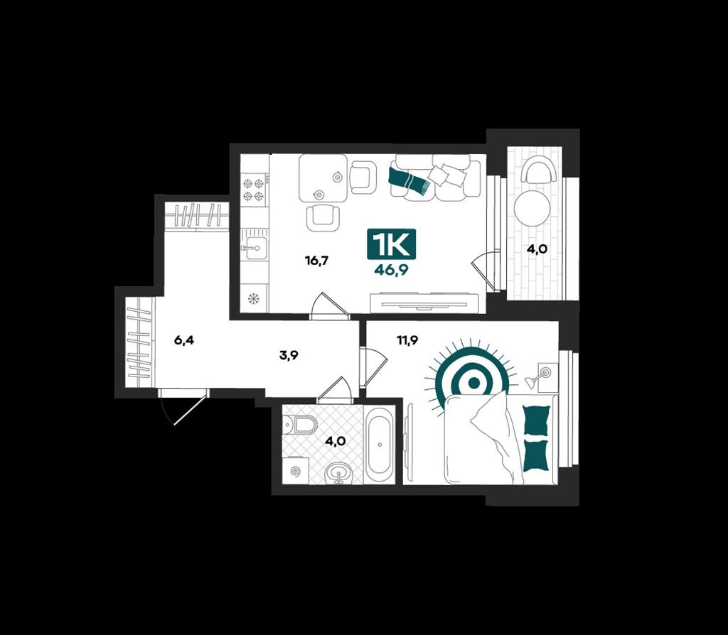 общая 46,9 м2, жилая 11,9 м2, кухни 0 м2 |