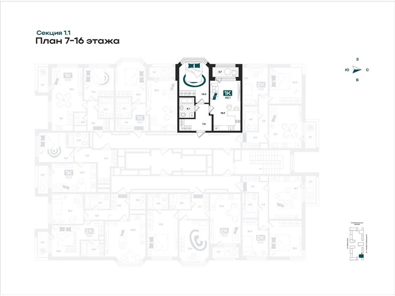 общая 48,1 м2, жилая 14 м2, кухни 0 м2 |