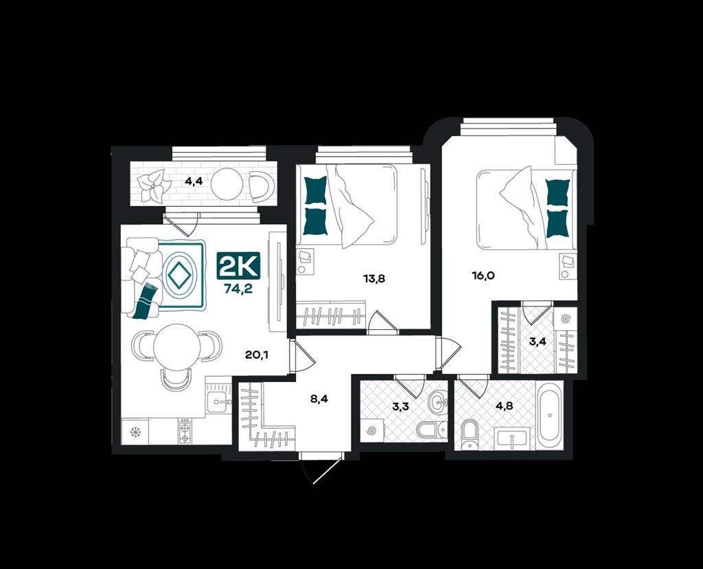 общая 74,2 м2, жилая 29,8 м2, кухни 0 м2 |