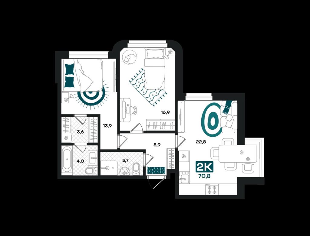 общая 70,8 м2, жилая 30,8 м2, кухни 0 м2 |