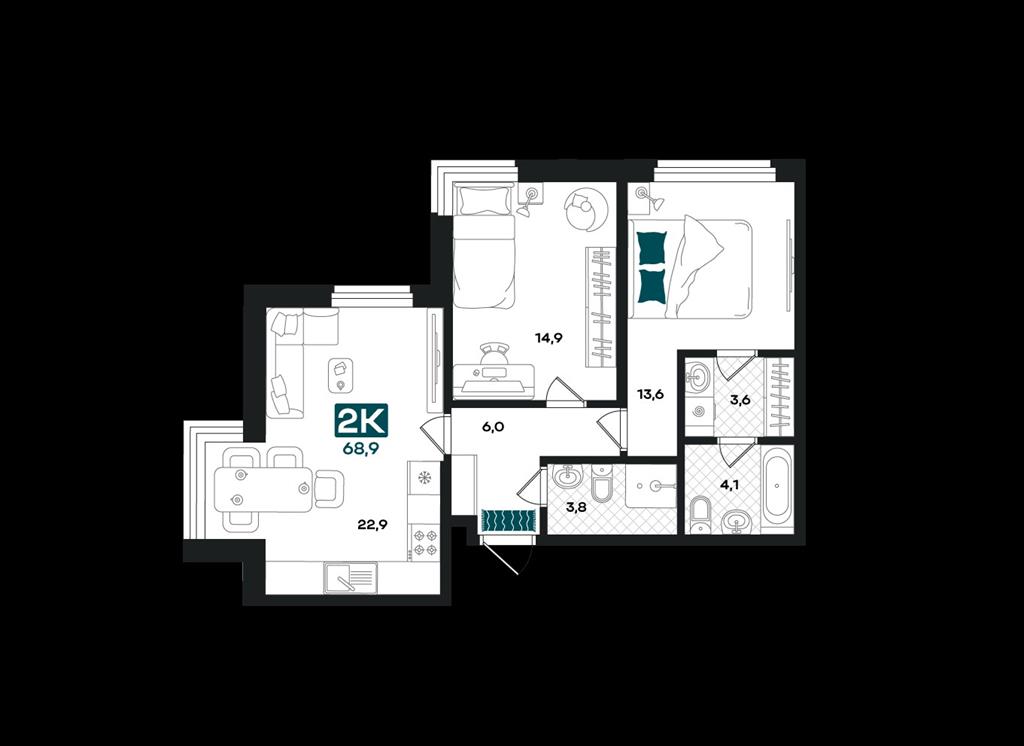 общая 68,9 м2, жилая 28,5 м2, кухни 0 м2 |