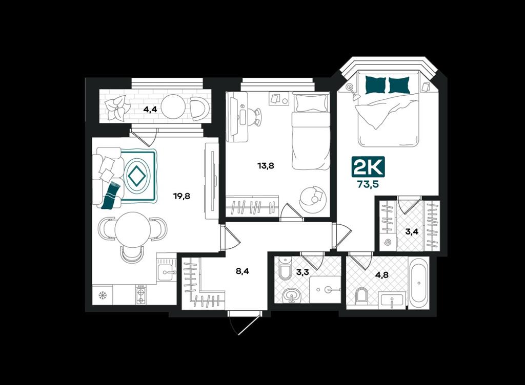 общая 73,5 м2, жилая 29,4 м2, кухни 0 м2 |