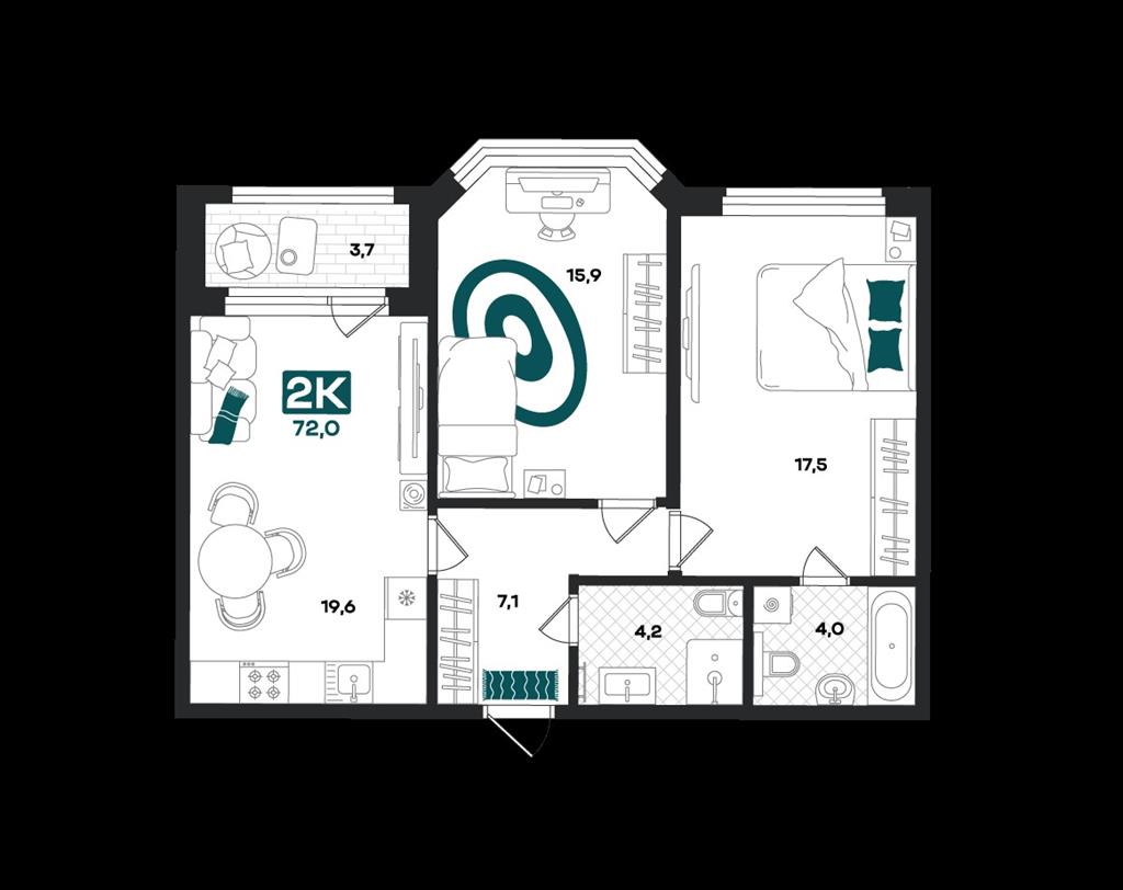 общая 72 м2, жилая 33,4 м2, кухни 0 м2 |