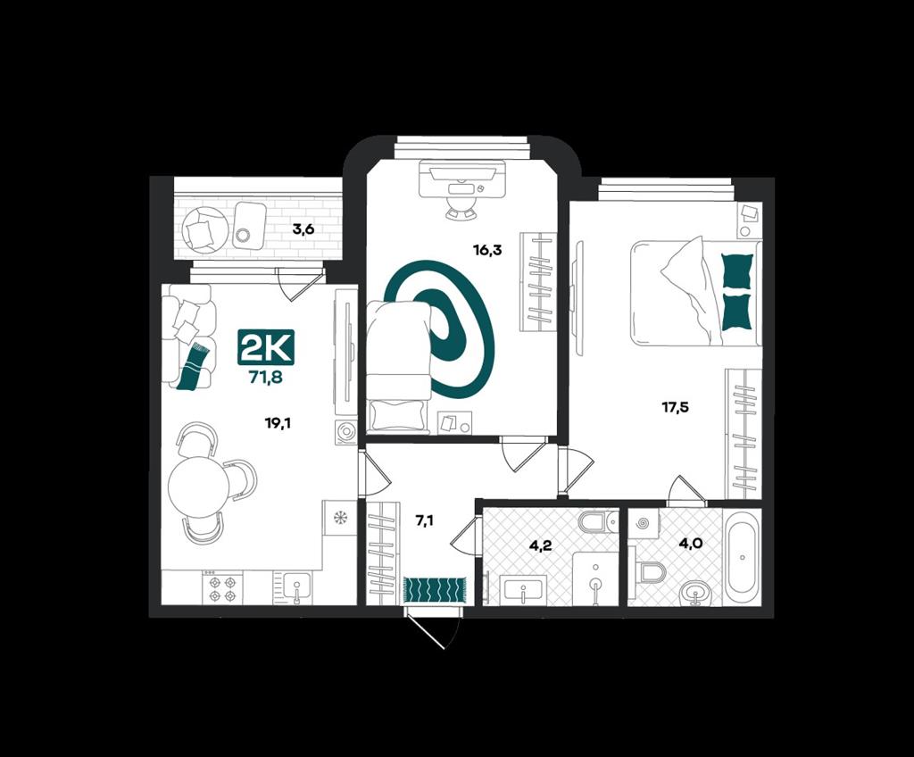 общая 71,8 м2, жилая 33,8 м2, кухни 0 м2 |