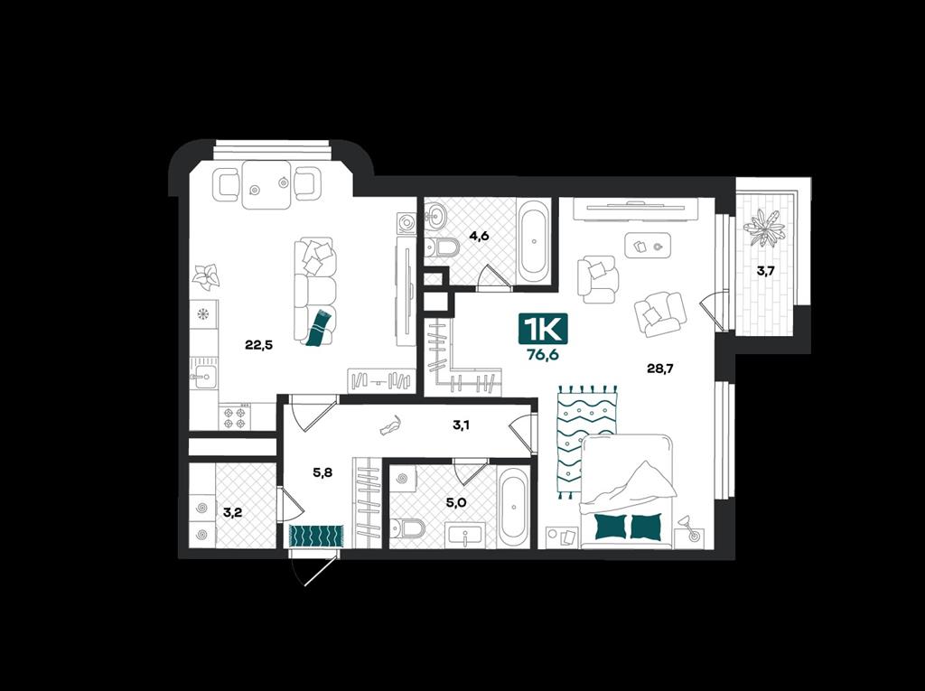 общая 76,6 м2, жилая 28,7 м2, кухни 0 м2 |