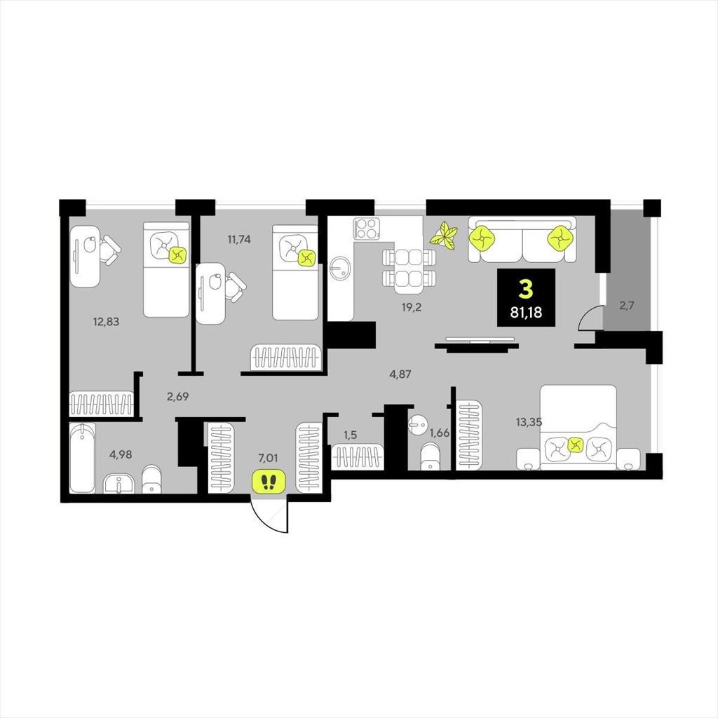 Трехкомнатная квартира 81,18 м2 по ул. Разведчика Кузнецова 7 за 12660000 руб. |