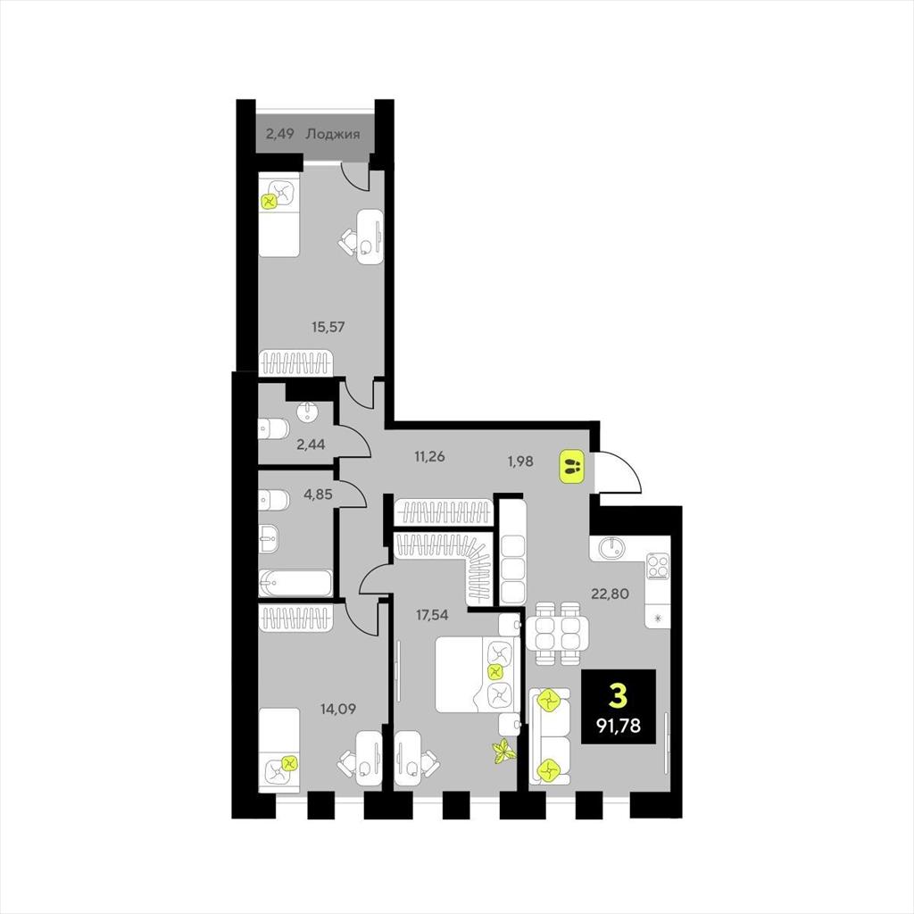 Трехкомнатная квартира 91,78 м2 по ул. Разведчика Кузнецова 7 за 13220000 руб. |