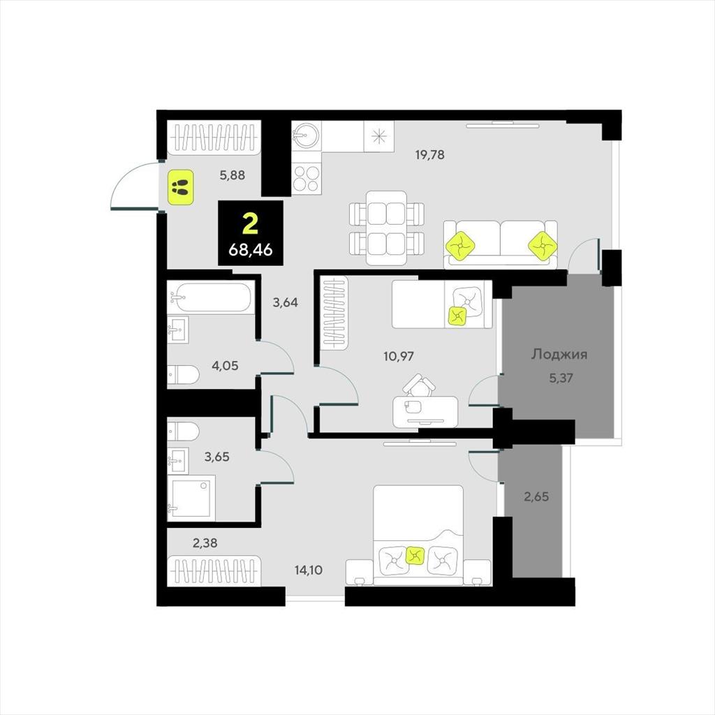 Двухкомнатная квартира 68,46 м2 по ул. за 11400000 руб. |
