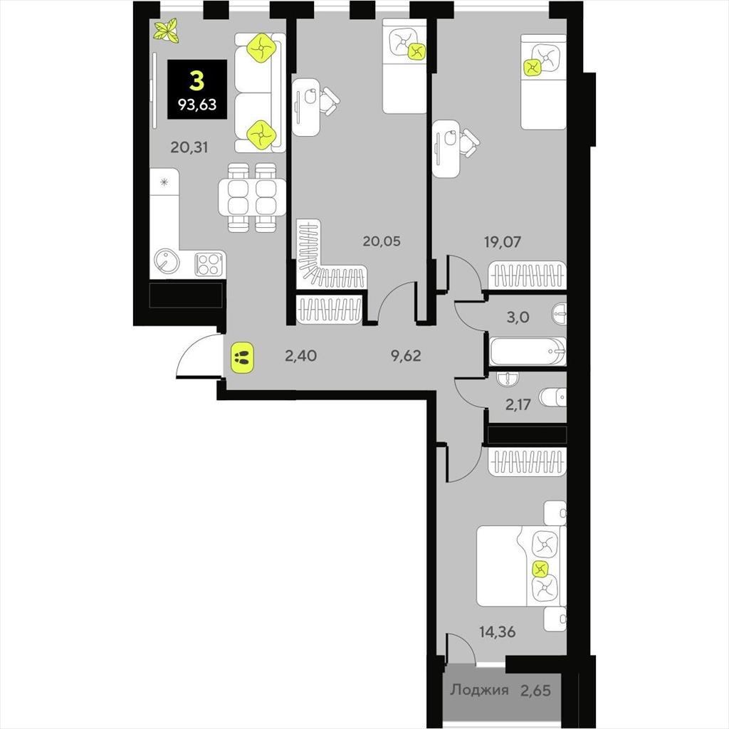 Трехкомнатная квартира 93,63 м2 по ул. ул разведчика Кузнецова 7 за 12030000 руб. |