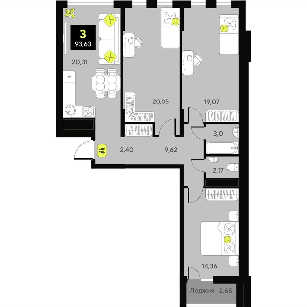 Трехкомнатная квартира 93,63 м2 по ул. ул разведчика Кузнецова 7 за 12130000 руб. |