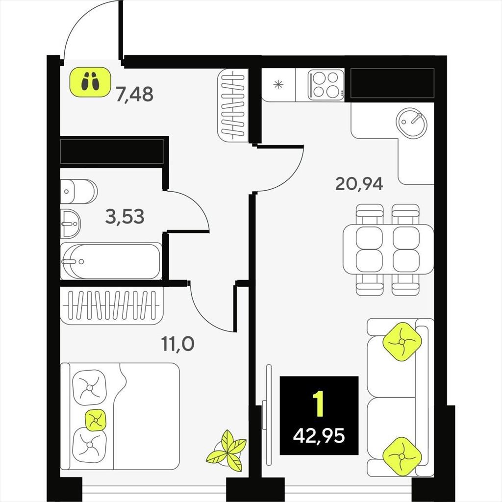 Однокомнатная квартира 42,95 м2 по ул. ул разведчика Кузнецова 7 за 8030000 руб. |