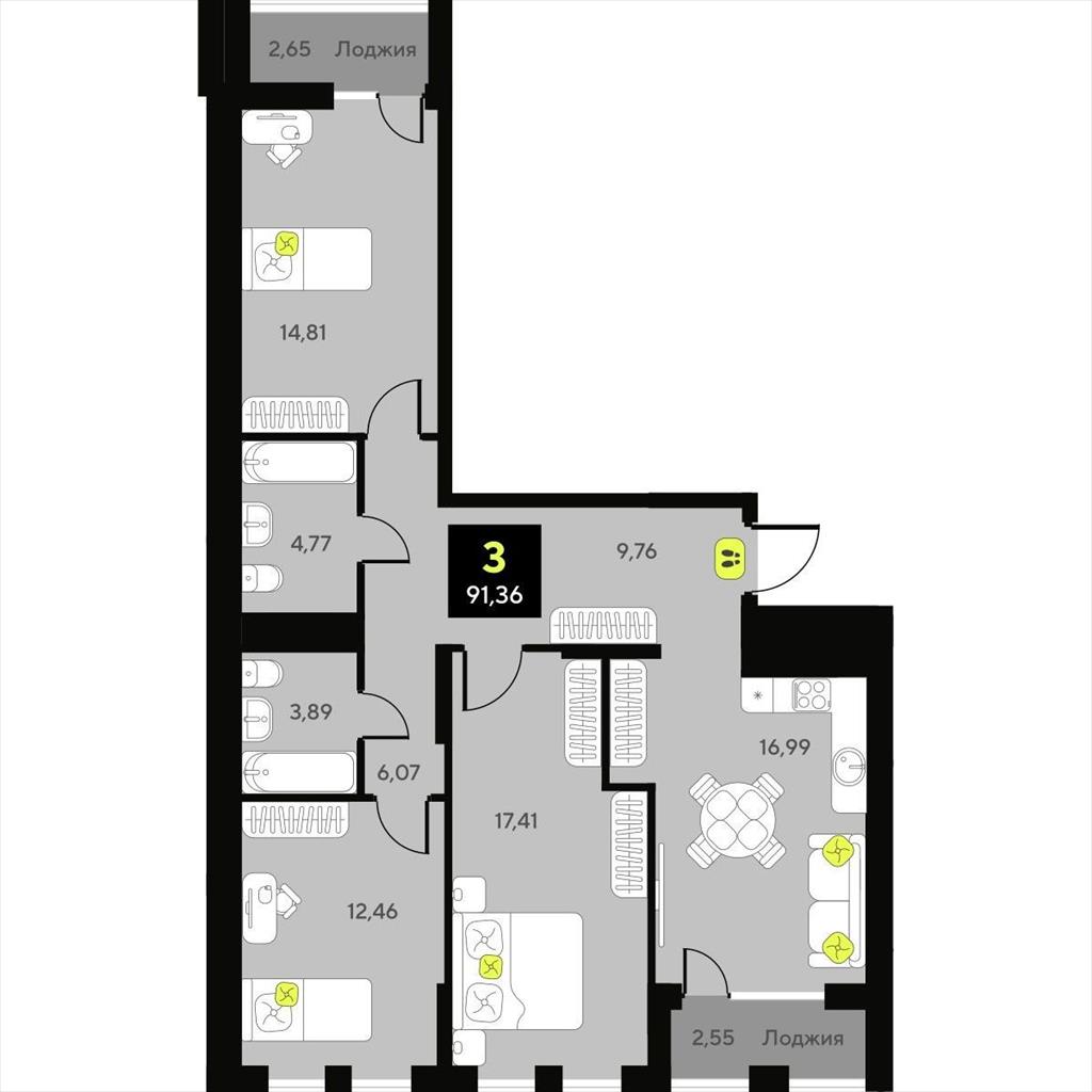 Трехкомнатная квартира 91,36 м2 по ул. ул разведчика Кузнецова 7 за 12030000 руб. |
