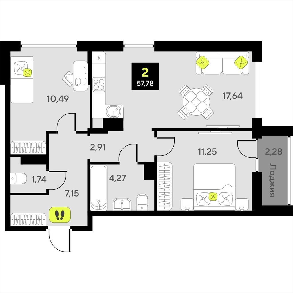 Двухкомнатная квартира 57,78 м2 по ул. за 9680000 руб. |