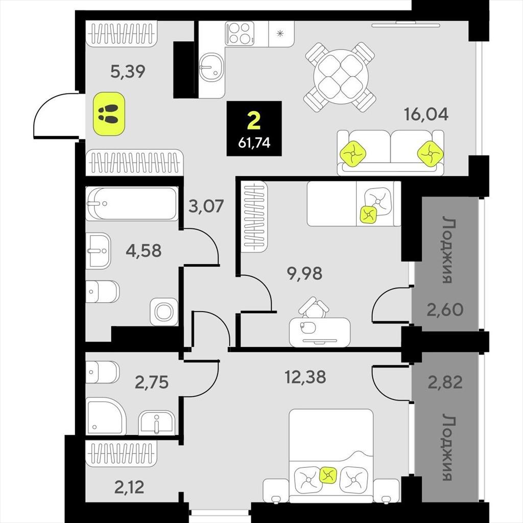 Двухкомнатная квартира 61,74 м2 по ул. за 9830000 руб. |