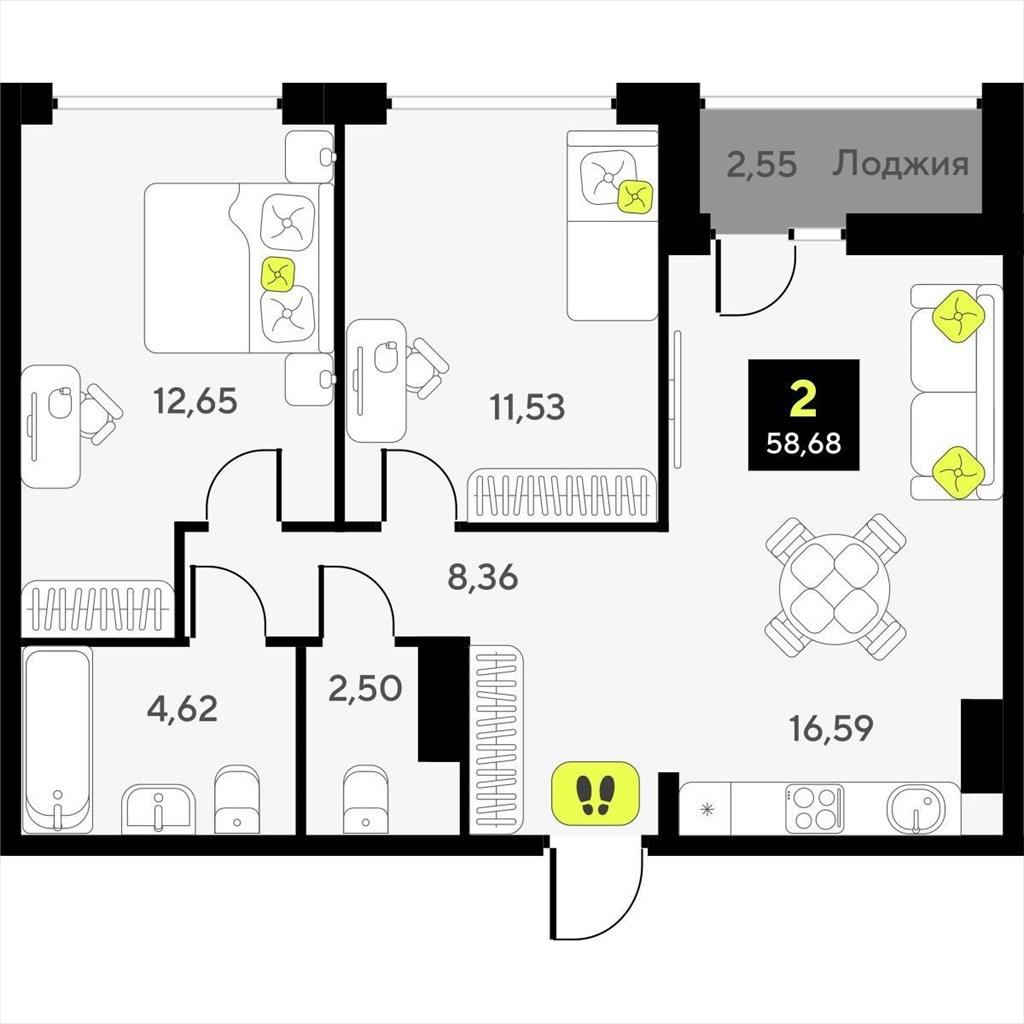 Двухкомнатная квартира 58,68 м2 по ул. за 9680000 руб. |