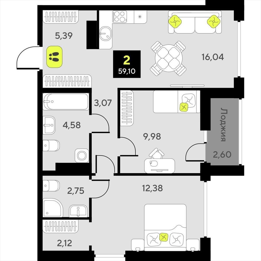 Двухкомнатная квартира 59,10 м2 по ул. за 10040000 руб. |