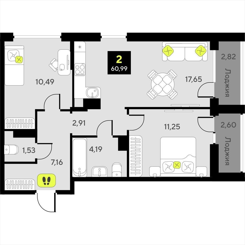 Двухкомнатная квартира 60,99 м2 по ул. за 10290000 руб. |