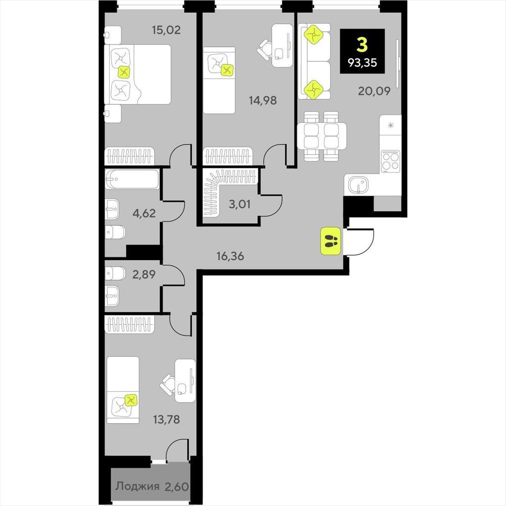 Трехкомнатная квартира 93,35 м2 по ул. за 12390000 руб. |