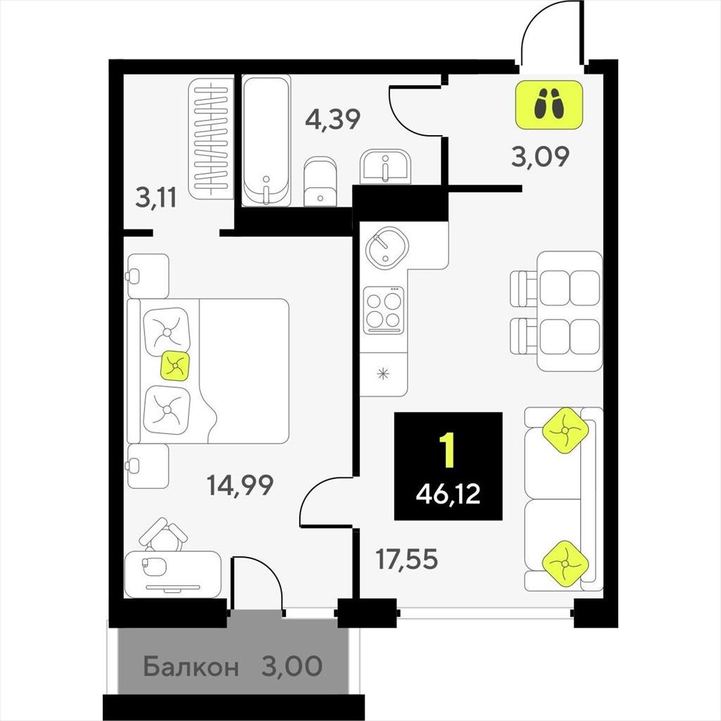 Однокомнатная квартира 46,12 м2 по ул. за 8060000 руб. |