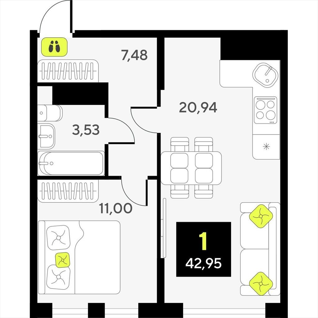 Однокомнатная квартира 42,95 м2 по ул. за 7600000 руб. |