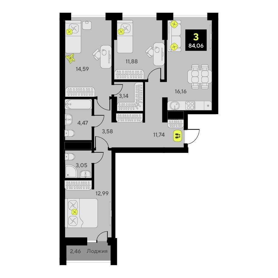 общая 84,06 м2, жилая 39,46 м2, кухни 0 м2 |