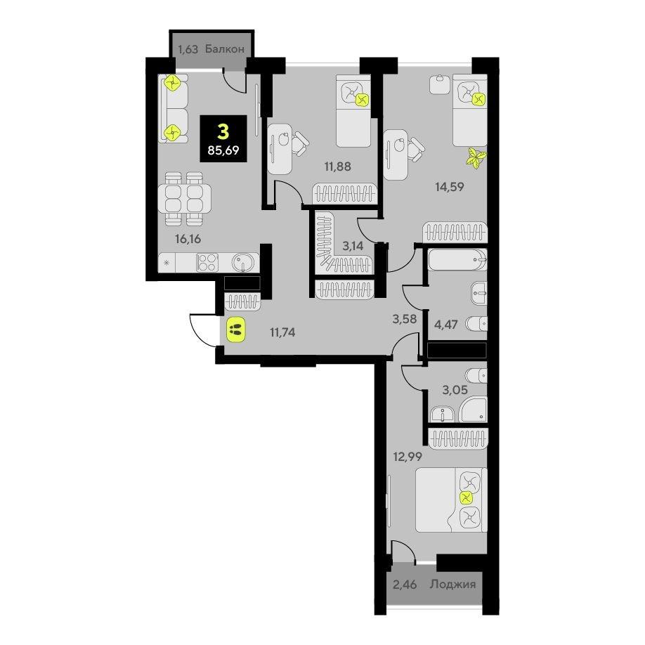 общая 85,69 м2, жилая 39,46 м2, кухни 0 м2 |