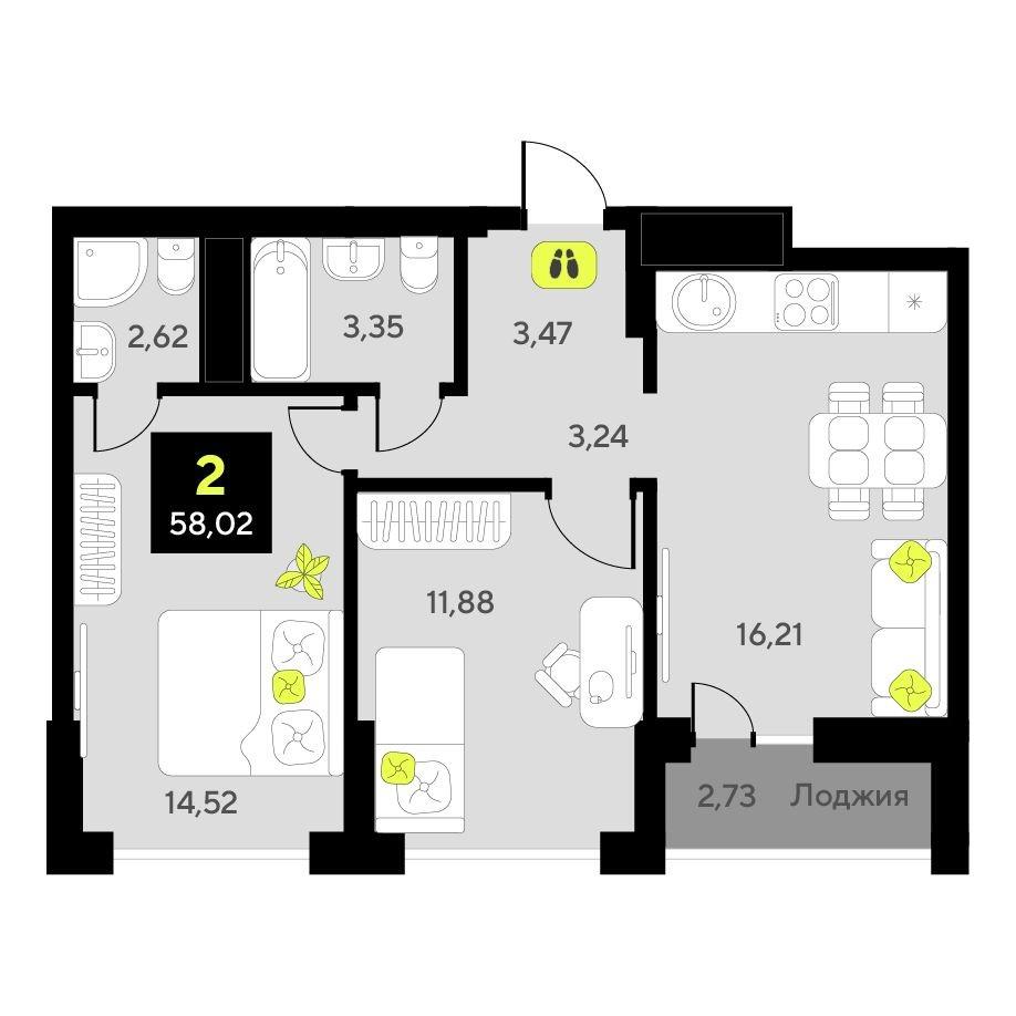 общая 58,02 м2, жилая 26,4 м2, кухни 0 м2 |