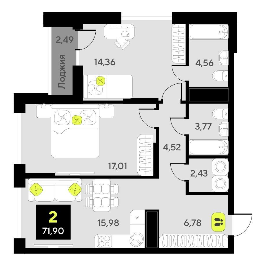 общая 71,9 м2, жилая 31,37 м2, кухни 0 м2 |