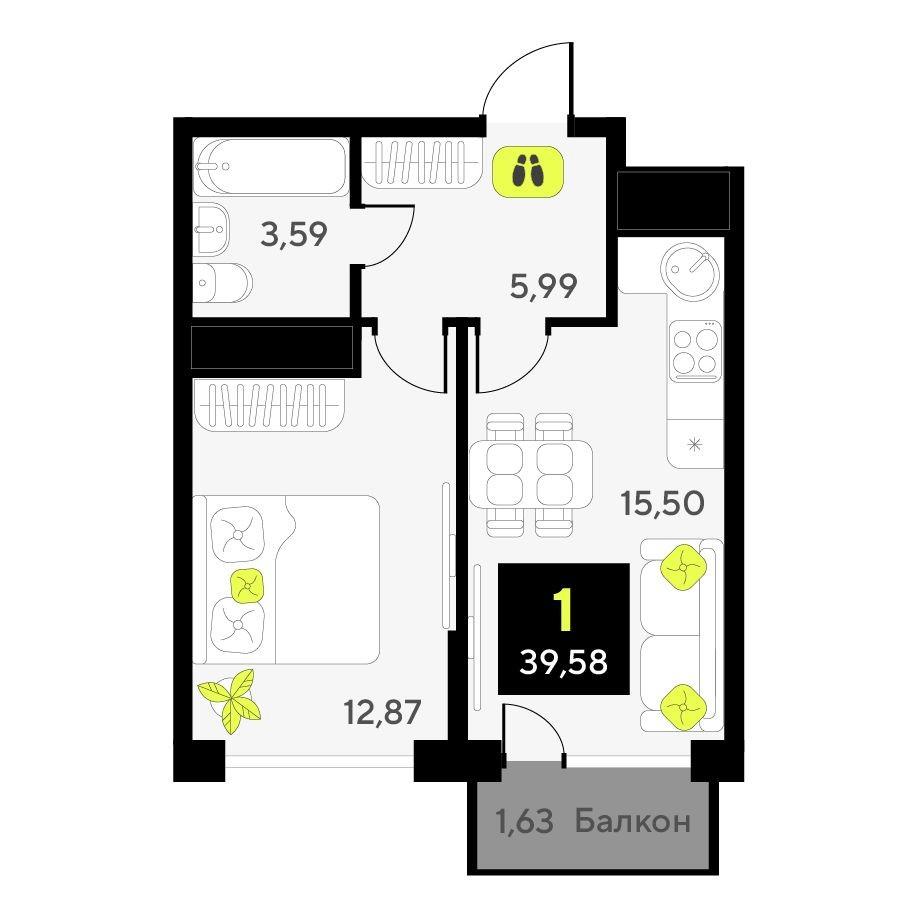 общая 39,58 м2, жилая 12,87 м2, кухни 0 м2 |
