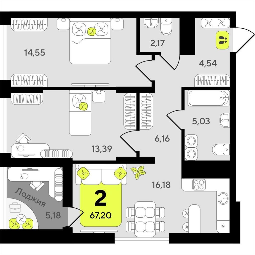 Двухкомнатная квартира 67,20 м2 по ул. ул разведчика Кузнецова 10 за 10070000 руб. |