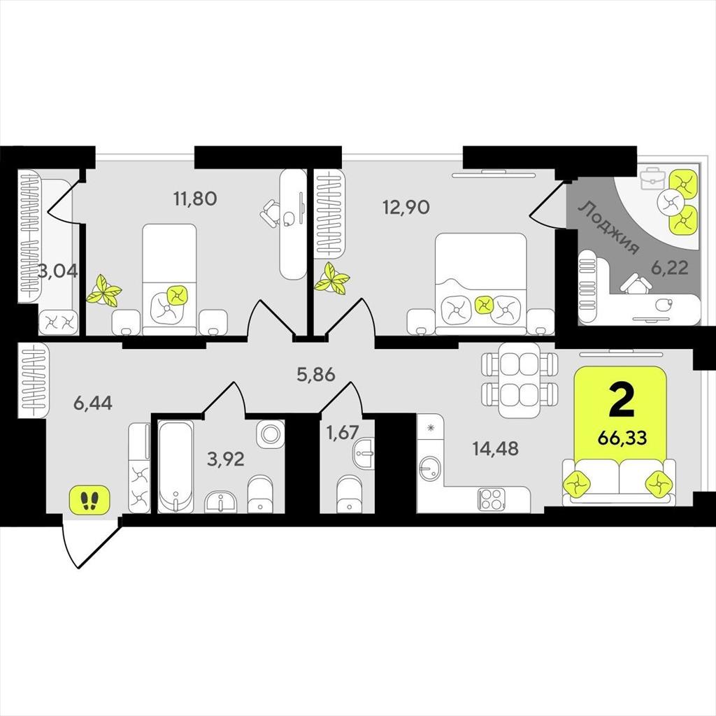 Двухкомнатная квартира 66,33 м2 по ул. ул разведчика Кузнецова 10 за 10370000 руб. |