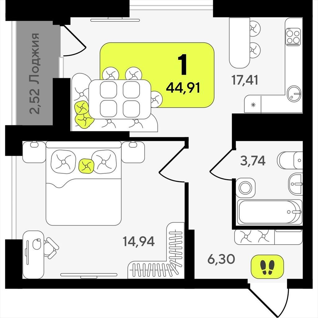 Однокомнатная квартира 44,91 м2 по ул. ул разведчика Кузнецова 10 за 7940000 руб. |