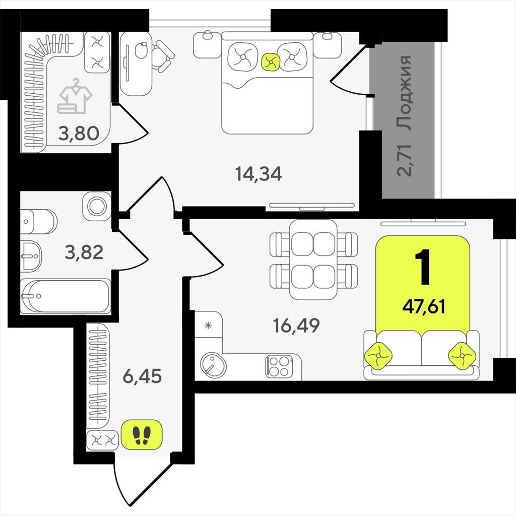 Однокомнатная квартира 47,61 м2 по ул. ул разведчика Кузнецова 10 за 8060000 руб. |