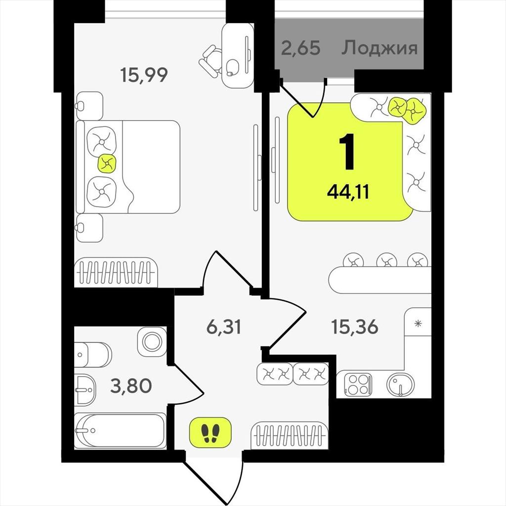 Однокомнатная квартира 44,11 м2 по ул. ул разведчика Кузнецова 10 за 7680000 руб. |