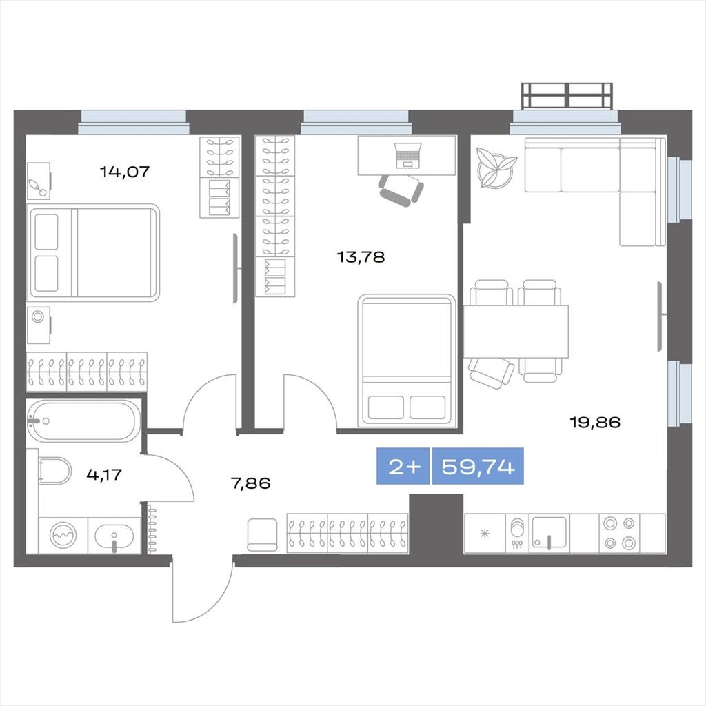 общая 59,74 м2, жилая 27,63 м2, кухни 0 м2 |