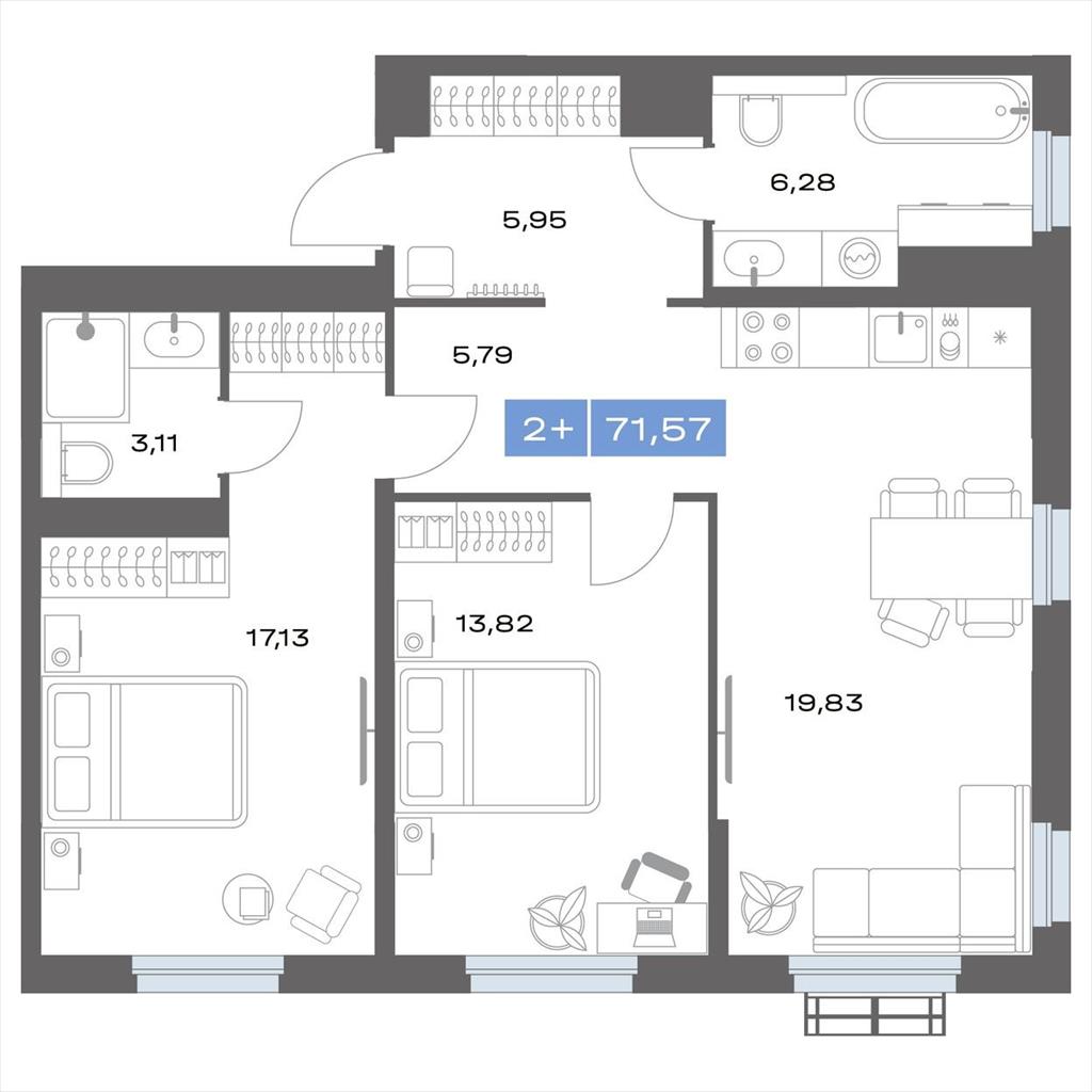 общая 71,99 м2, жилая 30,87 м2, кухни 0 м2 |