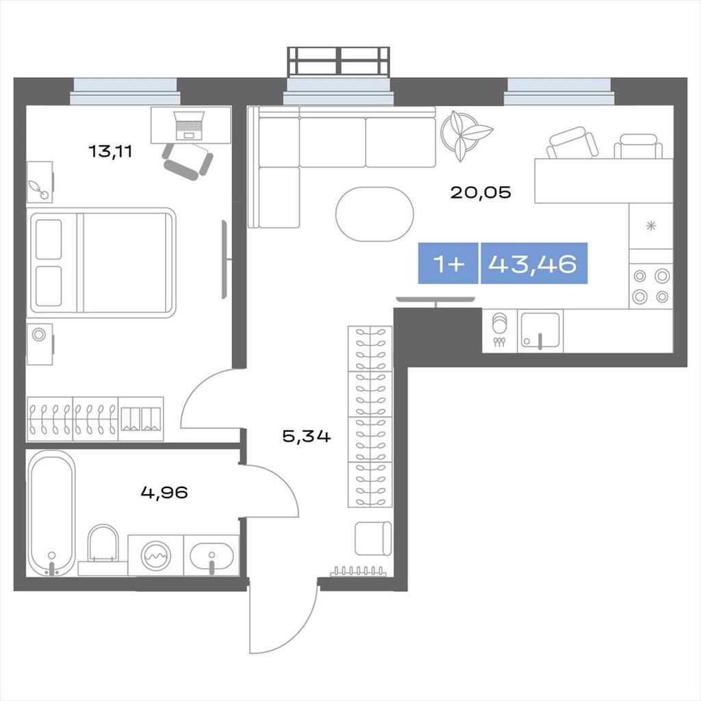 общая 43,46 м2, жилая 13,02 м2, кухни 0 м2 |