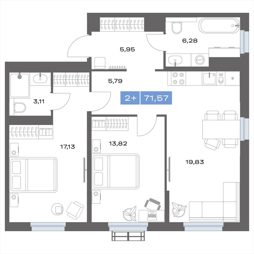 общая 71,99 м2, жилая 30,87 м2, кухни 0 м2 |