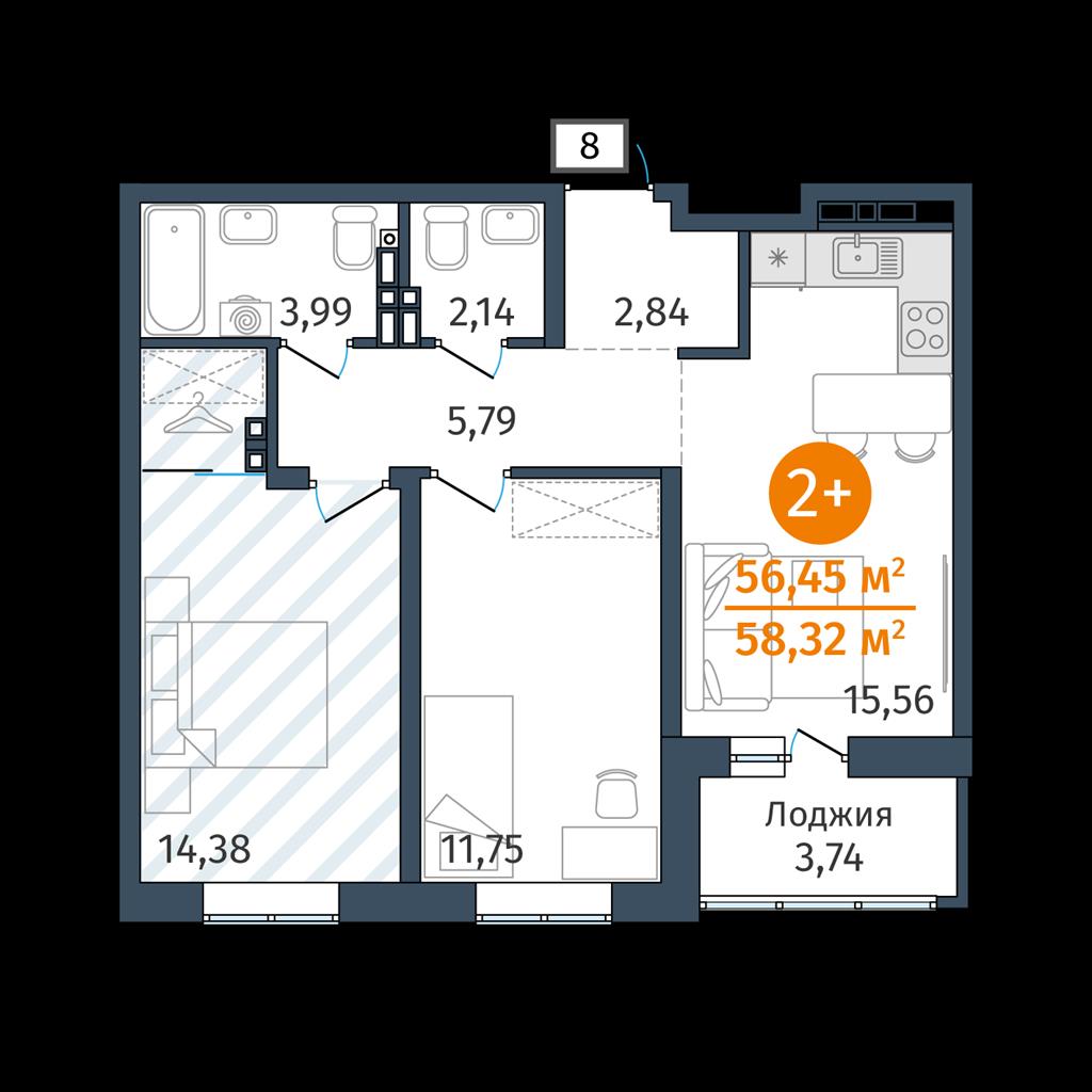 Двухкомнатная квартира 56,45 м2 по ул. 2.2.1 за 7536000 руб. |