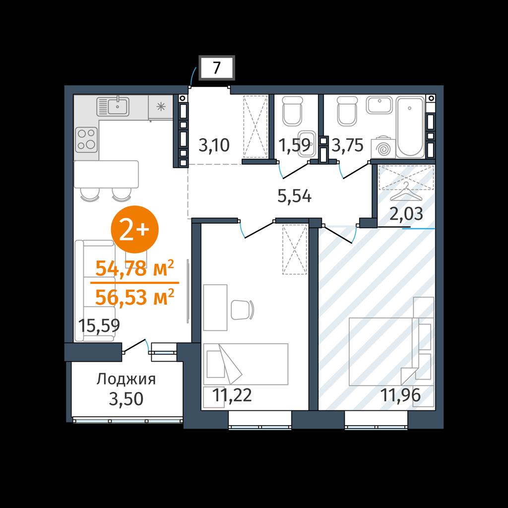 Двухкомнатная квартира 54,78 м2 по ул. 2.2.1 за 7340000 руб. |