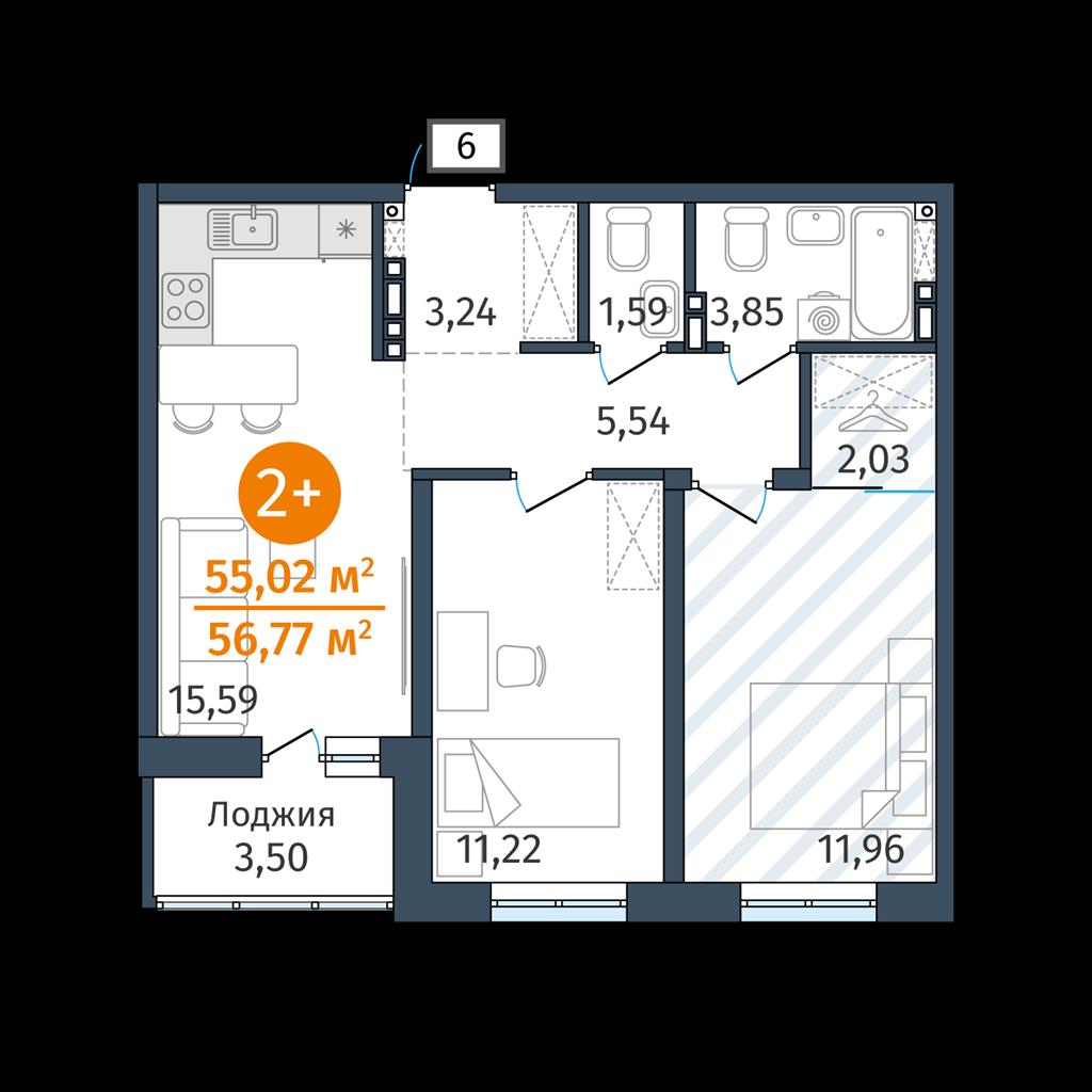 Двухкомнатная квартира 55,02 м2 по ул. 2.2.1 за 7317000 руб. |