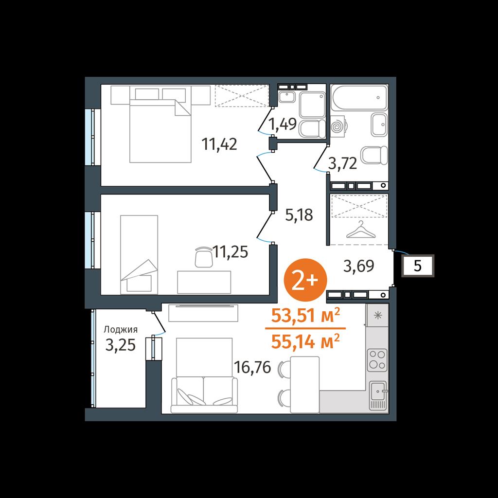 Двухкомнатная квартира 53,51 м2 по ул. Сергея Джанбровского 25 за 7100000 руб. |