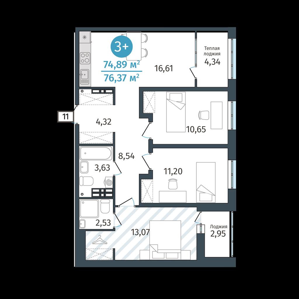 Трехкомнатная квартира 74,89 м2 по ул. Сергея Джанбровского 25 за 9991000 руб. |