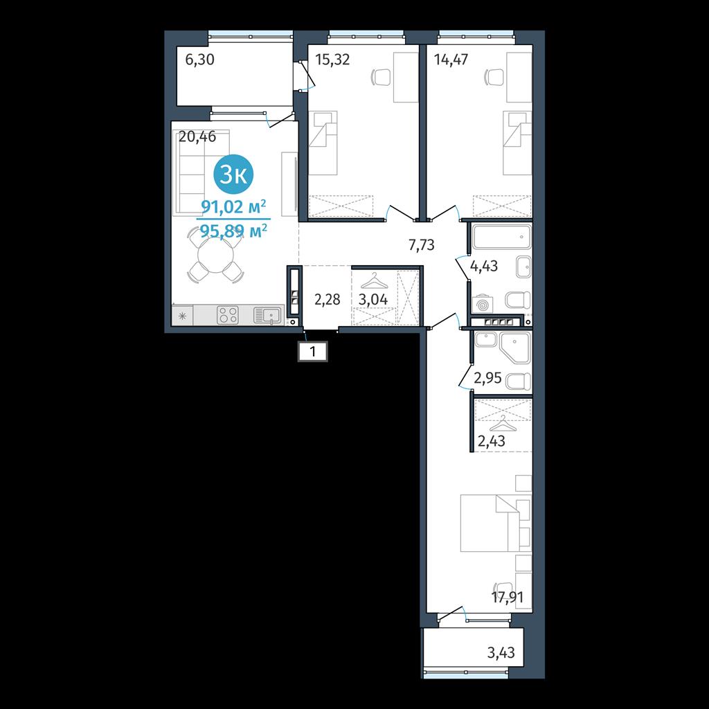 общая 91,02 м2, жилая 0 м2, кухни 20,46 м2 |